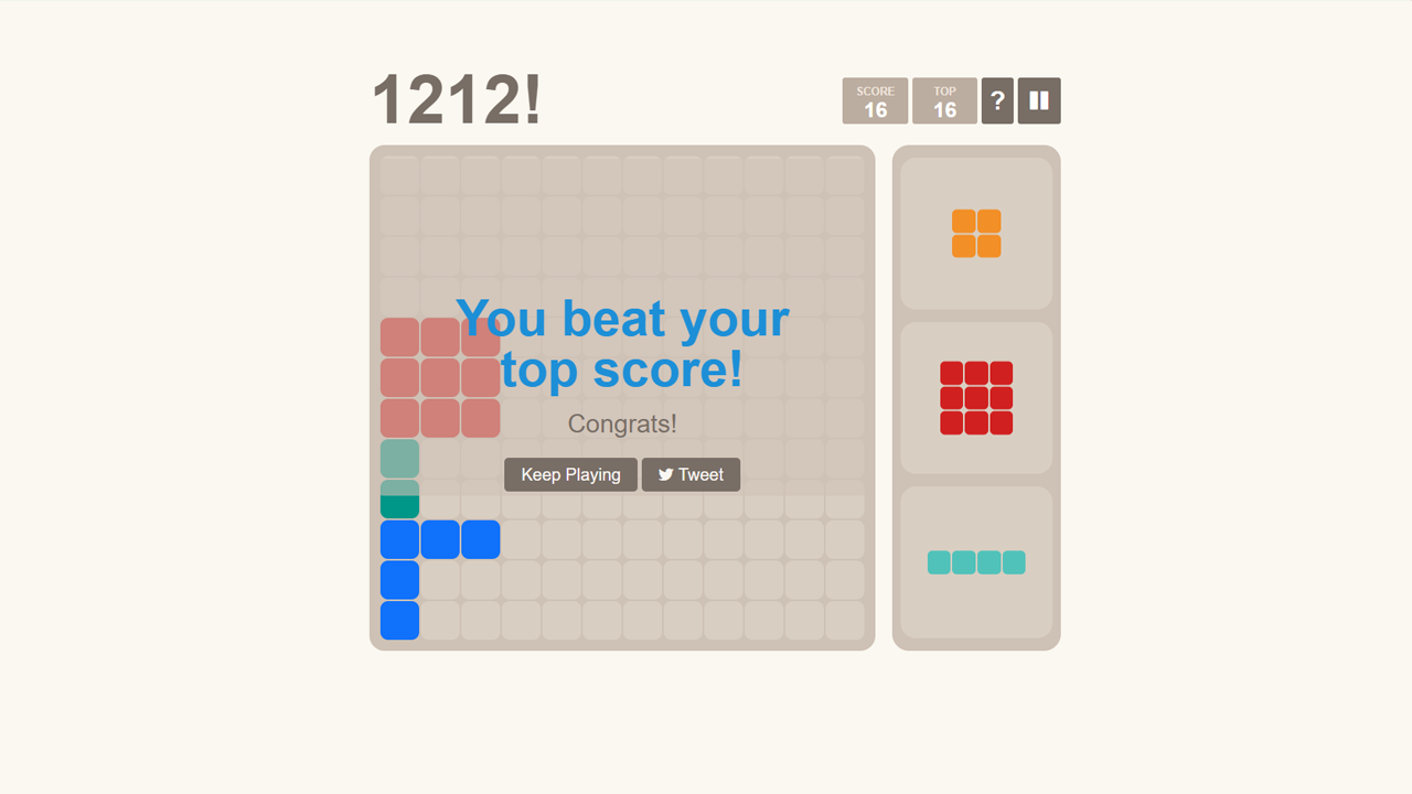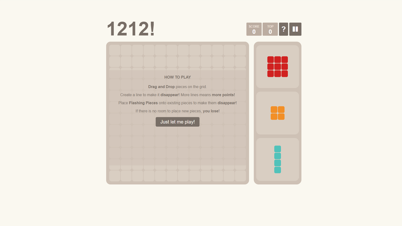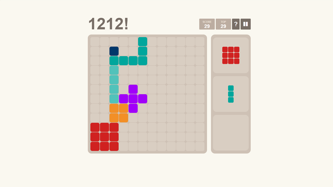 Play 1212! Online, the ultimate brain-challenging puzzle game! Fit all the pieces perfectly and keep the grid from filling up. How long can you strategize and stay in the game?